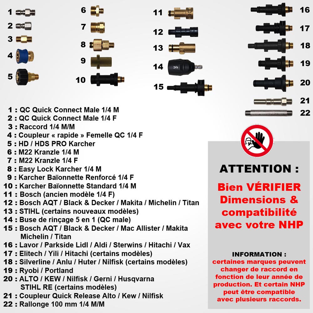 (ALTO / NILFISK / KEW / KRANZLE / KARCHER / KARCHER HD / BOSCH / STIHL / LAVOR / Raccord Rapide PRO)