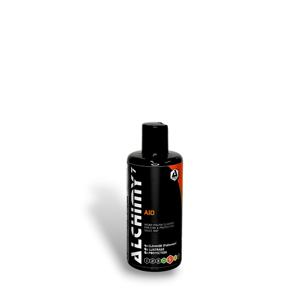 AIO Alchimy offre, en une seule application : le polissage « non abrasif », le lustrage et la protection de la carrosserie. Elimine les résidus d’insectes, de goudron et autres traces (d’eau, de gomme, etc). Sa composition avancée corrige les légères micro-rayures et nourrit la peinture pour raviver la couleur. Riche en NANO-polymères, il dépose un film de protection longue durée, hydrophobe et très résistant aux contaminants, au sel, aux rayons UV et à la décoloration. Renforce l’éclat et la brillance de la peinture. Applicable sur tous types de peinture. Protège également les jantes en alliage, le chrome, les optiques de phare, les pare-chocs et plastiques extérieurs.